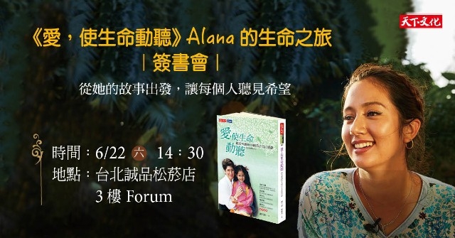 6/22(六)14:30《愛,使生命動聽》Alana的生命之旅簽書會上,她將從自己的故事出發,希望能鼓舞更多人,以積極、正向的態度,面對生命的挑戰,也學會付出無私的愛。