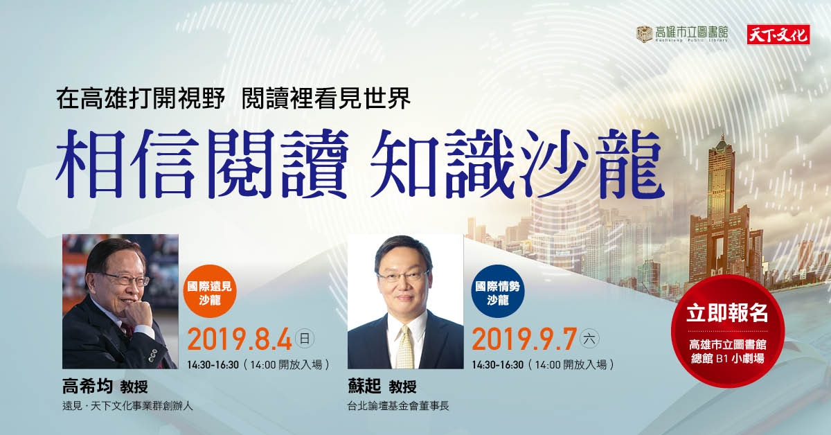 「相信閱讀.知識沙龍」系列講座,將以「遠見、格局、視野」為核心,邀請權威大師齊聚高雄,以知識為名,興起一種在地認同,是閱讀、是相約前往圖書館的路上。