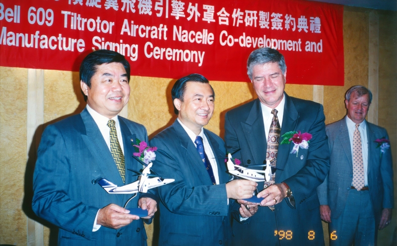 圖片來源:天下文化,《以5微米連結世界》1998年,與美國直升機製造商貝爾德事隆(Bell Helicopter Textron)簽訂生產609引擎外罩合約。左為沈文振、中為時任中國生產力中心董事長尹啟銘。