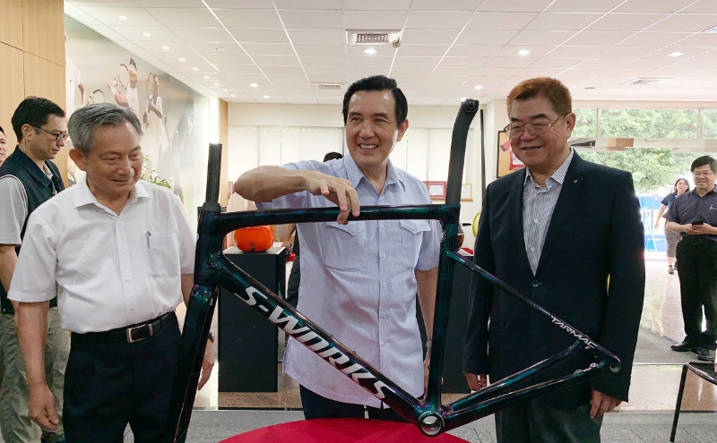 圖片來源:天下文化,《以5微米連結世界》 2019年,前總統馬英九(中)三度拜訪拓凱總部,對於可單手輕鬆拿起的碳纖維車架,十分驚豔。