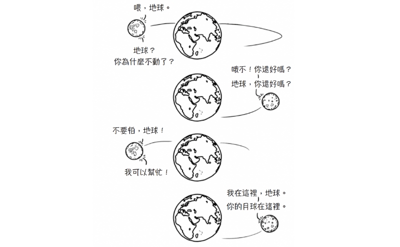 事實上,安德魯設想的情境所造成的後果,恐怕得靠月球(我們最忠實的伴侶)來解除。目前,地球的自轉比月球的快,潮汐使地球的自轉變慢,同時也把月球推離地球(註3)。如果地球停止自轉,月球便不再漂離地球。月球的潮汐作用將不再使地球的自轉減速,反倒會加速。 悄悄的、輕輕的,月球的重力會拉扯我們的地球......