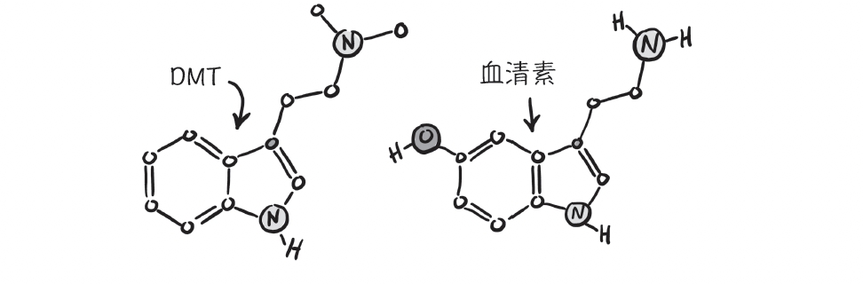 另一種致幻物質,也就是簡稱DMT 的N,N- 二甲基色胺,也可能提供線索。DMT 是死藤水(ayahuasca)中的精神作用成分,使用這種植物性迷幻藥是南美洲薩滿教的傳統。DMT在結構上和血清素類似,也會和相同的化學受體結合。據觀察,囓齒動物死亡時,視覺皮質中的DMT 濃度會飆升,這點和血清素類似。