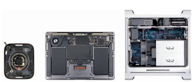 ↑ Apple Watch(左)、MacBook Air 與Power Mac 的整齊內部結構。(非等比例)