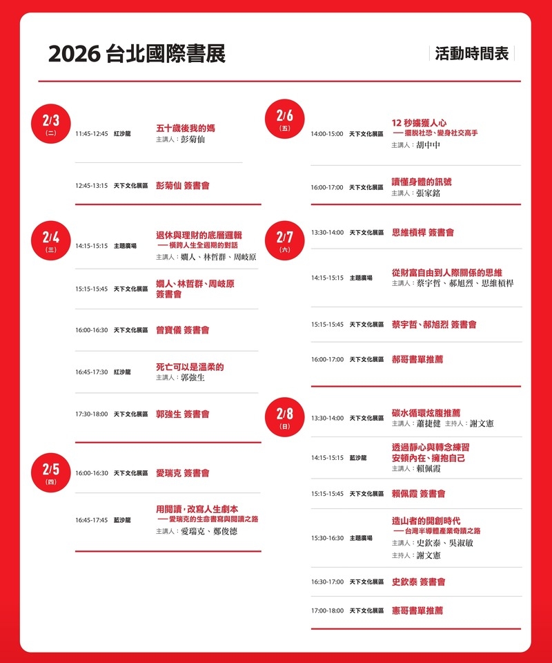 • 門票抵用金:2/3(二)~2/6(五) 購票入場即可獲得「等值抵用金」,全館消費不限金額皆可折抵 (詳細辦法請依TiBE台北國際書展官網與現場公告為主)