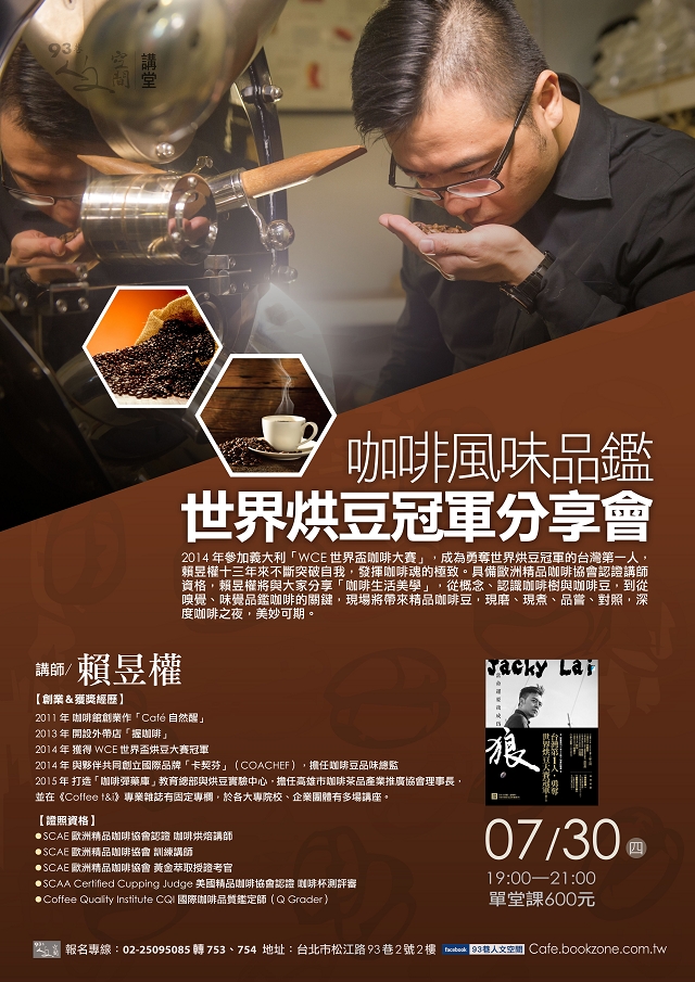 2014年參加義大利「WCE世界盃咖啡大賽」,成為勇奪世界烘豆冠軍的台灣第一人,賴昱權十三年來不斷突破自我,發揮咖啡魂的極致。具備歐洲精品咖啡協會認證講師資格,賴昱權將與大家分享「咖啡生活美學」,從概念、認識咖啡樹與咖啡豆,到從嗅覺、味覺品鑑咖啡的關鍵,現場將帶來精品咖啡豆,現磨、現煮、品嘗、對照,深度咖啡之夜,美妙可期。